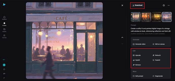 Emphasize emotional texture with the creative customization that Dreamina has to offer. Adjust lighting or add missing details with inpaint, expand to reveal more about the setting, remove to simplify the frame, or retouch to soften imperfections while maintaining authenticity. When your image feels alive with sentiment, click Download to save your finished piece-a visual memory reborn through digital art.